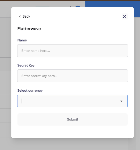 To connect to Flutterwave on the dashboard, follow these steps:Enter the Name: In the “Name” field, provide a label for this connection (e.g., “Flutterwave Business Account”). This name helps you easily identify this specific Flutterwave connection.Enter the Secret Key: In the “Secret Key” field, enter your Flutterwave Secret Key. This key is used to securely connect your Flutterwave account to the platform.You can find your Secret Key in your Flutterwave dashboard: